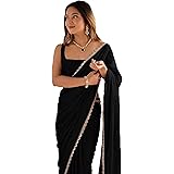 SHOPAZ Ready To Wear Saree For Women Black Georgette One Minute Readymade Scalloped Border Lace With Unstitched Blouse